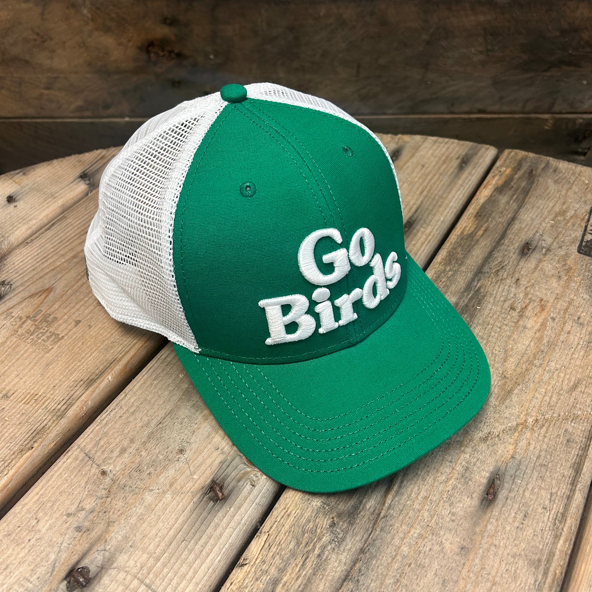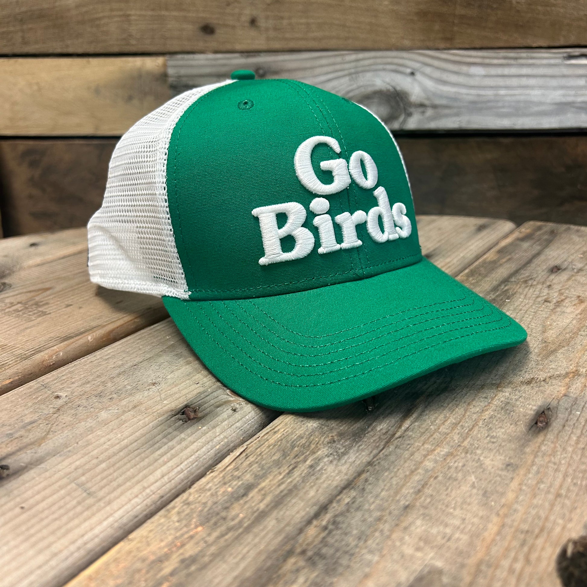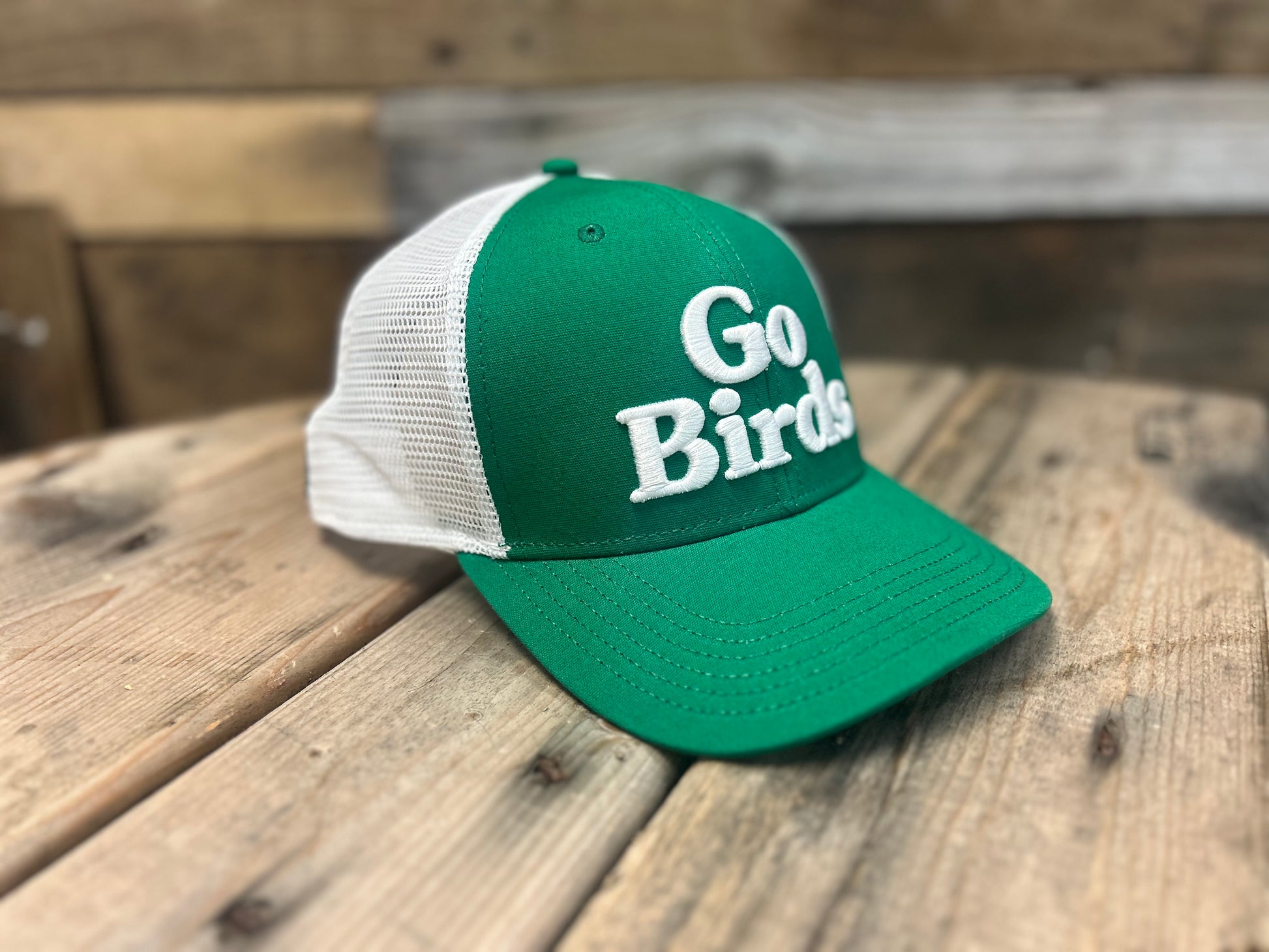 Go Birds! It’s as simple as that. Super simple and clean design with white slightly raised lettering. Embroidered on a mid pro Kelly green and white mesh Legacy hat. One size fits most. Order now and have it for opening night.
