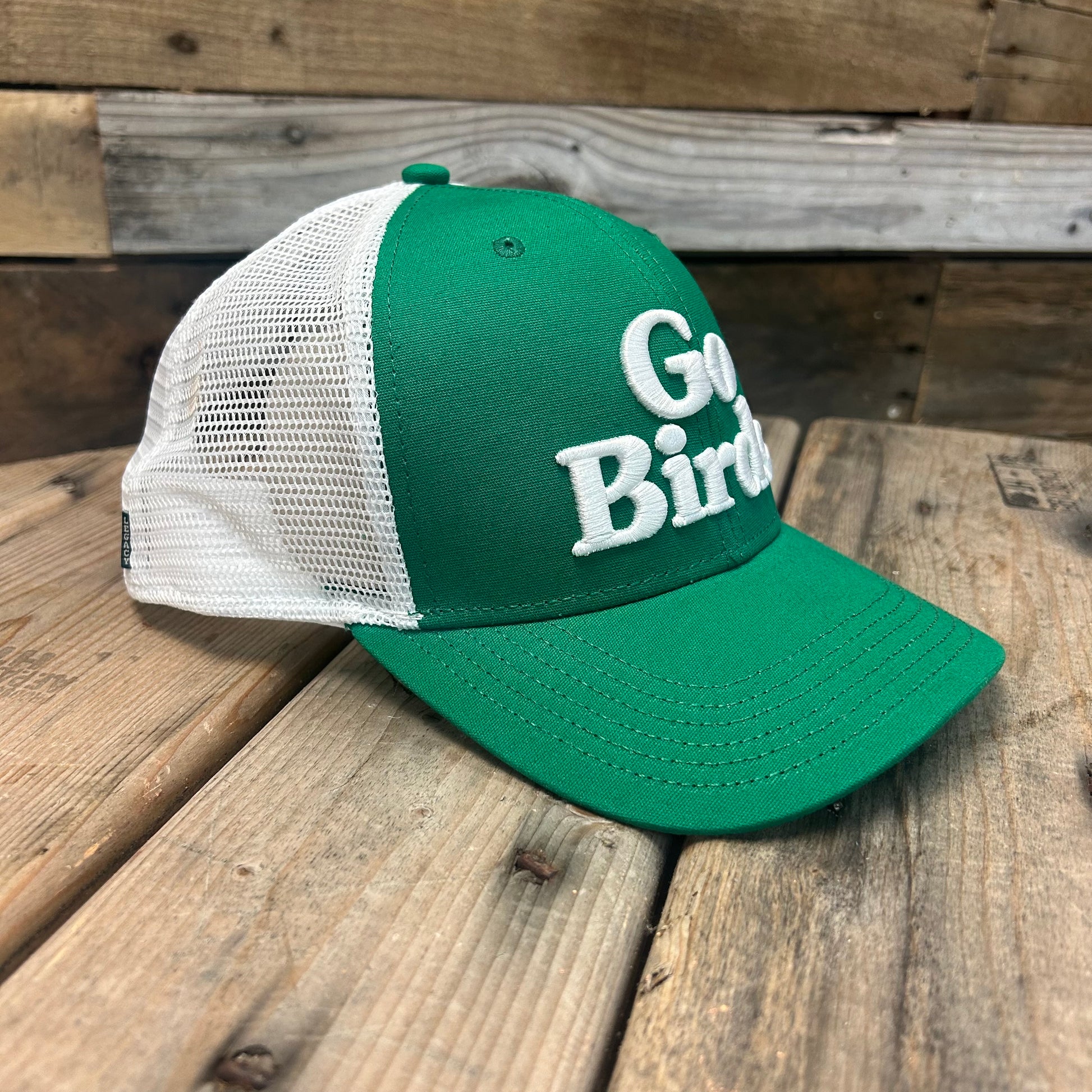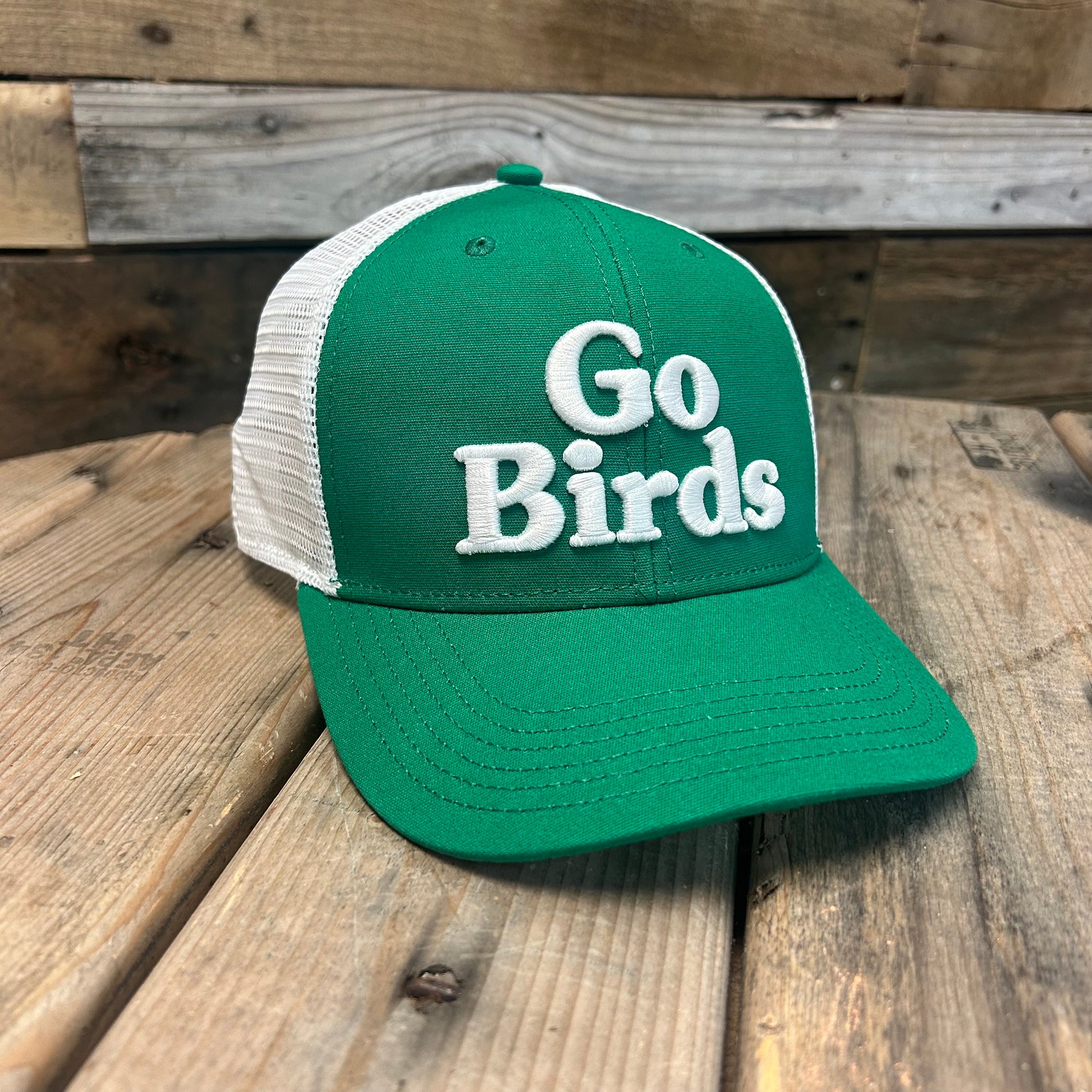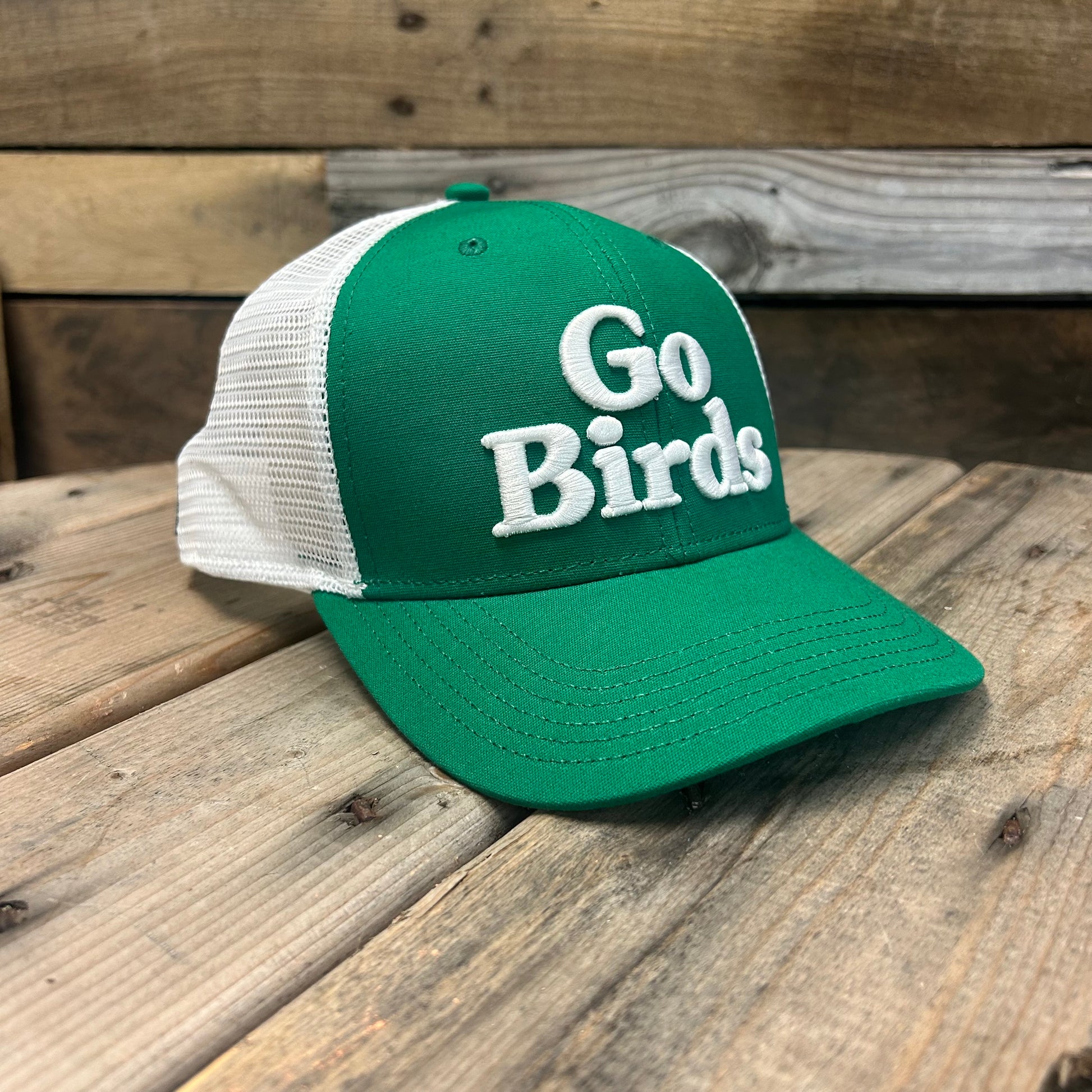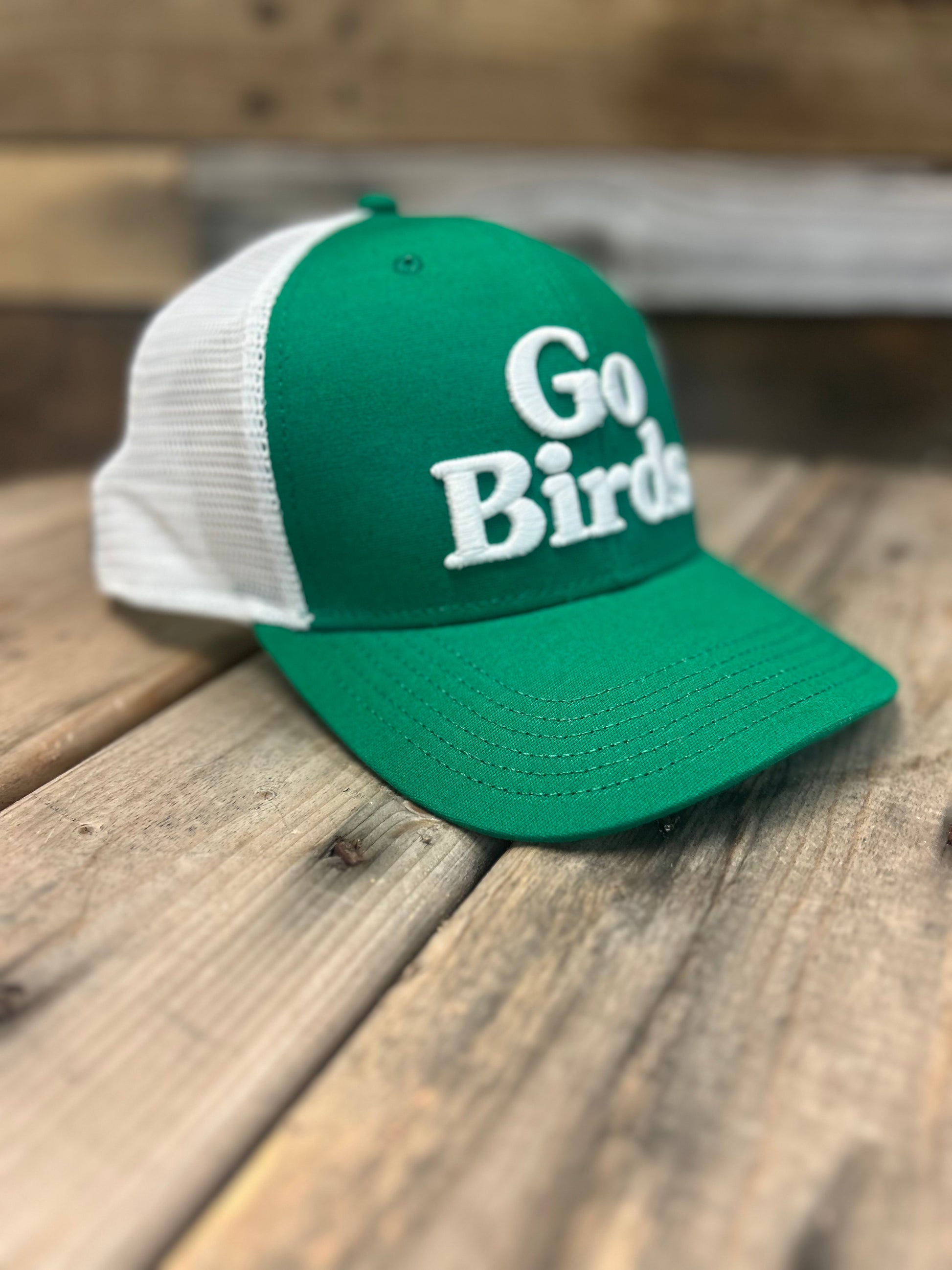 Go Birds! It’s as simple as that. Super simple and clean design with white slightly raised lettering. Embroidered on a mid pro Kelly green and white mesh Legacy hat. One size fits most. Order now and have it for opening night.