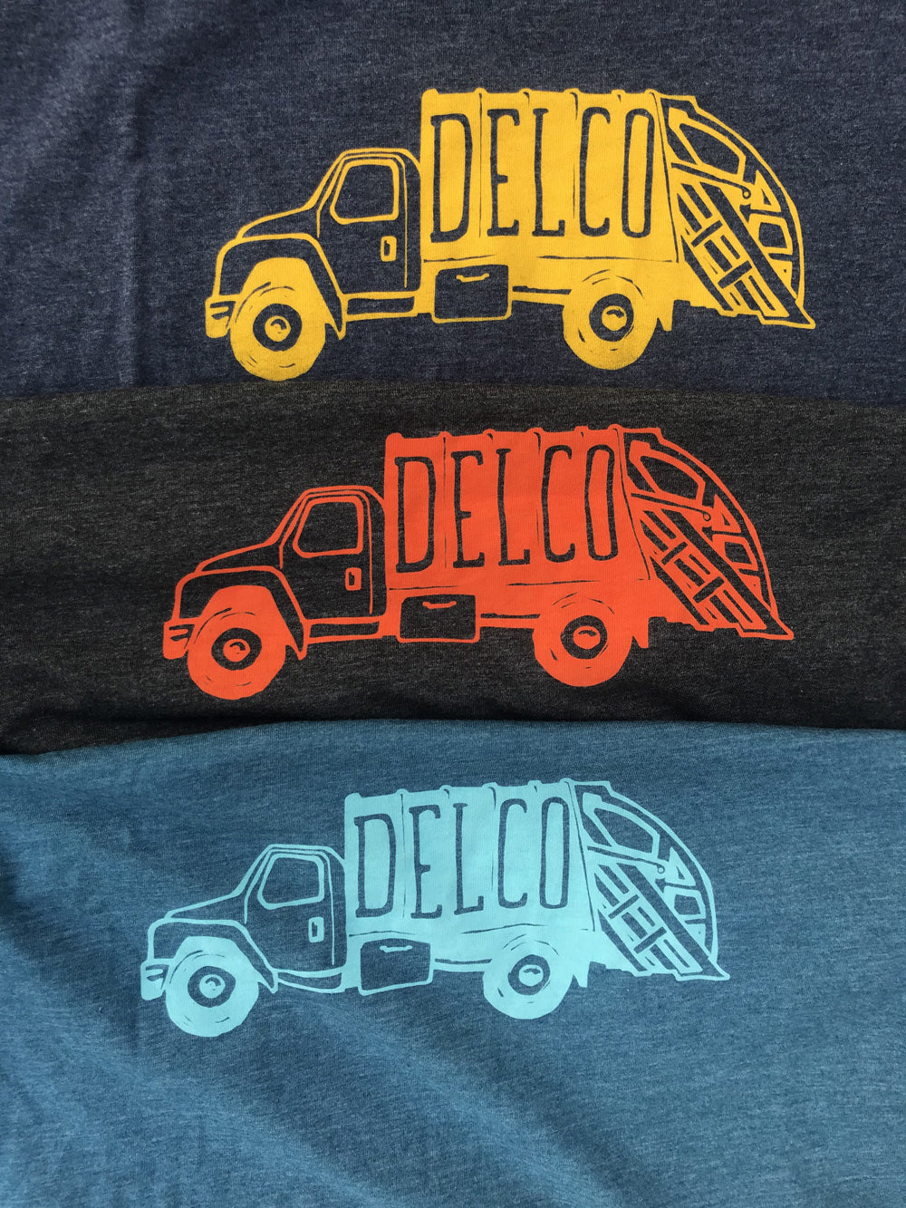 Soft style T with an illustration of an iconic DELCO Trash Truck printed in teal on the front and a Blue Rooted logo on the back near the collar. Shop all DELCO Trash